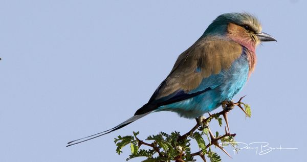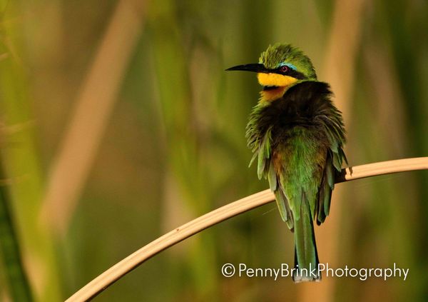 This is a Little Bee Eater! On the Chobe River in Botswana. Tiny, and doesn't sit still for long, except to preen. What beautiful colouring!